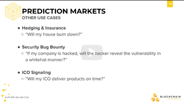 We can use prediction markets to “buy information.” Use cases of prediction markets include insurance, bug bounties, ICO signaling, and futarchy.
